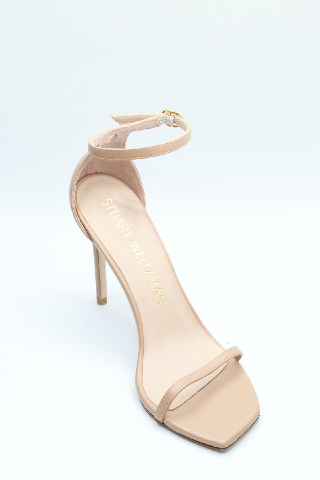 A sleek and minimalist pair of Stuart Weitzman sandals, featuring thin straps, a slender heel, and smooth, light-colored leather.